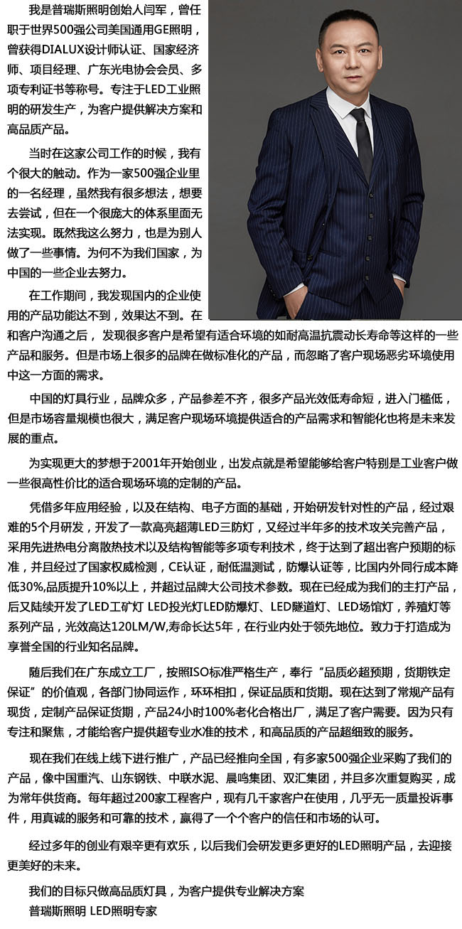 證書、防爆證書等,特色產(chǎn)品有自開模具的LED一體化三防燈、COB模組燈具等,可為各大公司OEM貼牌生產(chǎn)燈具。在行業(yè)內(nèi)處于領先地位。致力于打造成為享譽全國的行業(yè)知名品牌。我們的目標只做高品質(zhì)燈具,為客戶提供專業(yè)解決方案。普瑞斯照明LED照明專家。