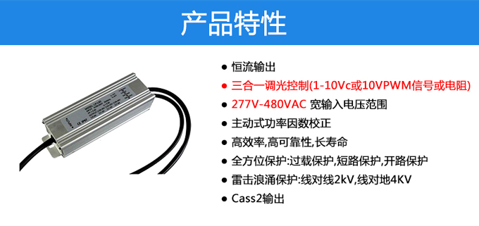 電源輸入電壓范圍為277-480Vac,具有高效、可靠、長壽命等優點。全方位的保護,包括過載保護、短路保護及開路保護,保證了此款產品的無障礙運轉。