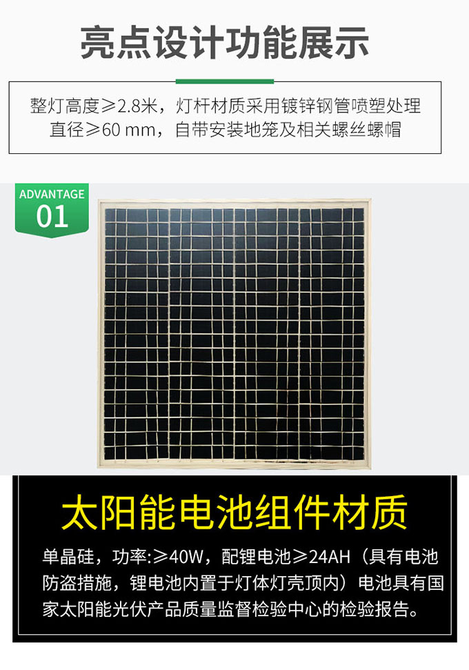 1.太陽能電池組件材質,單晶硅,功率:≥40W,配鋰電池≥24AH。