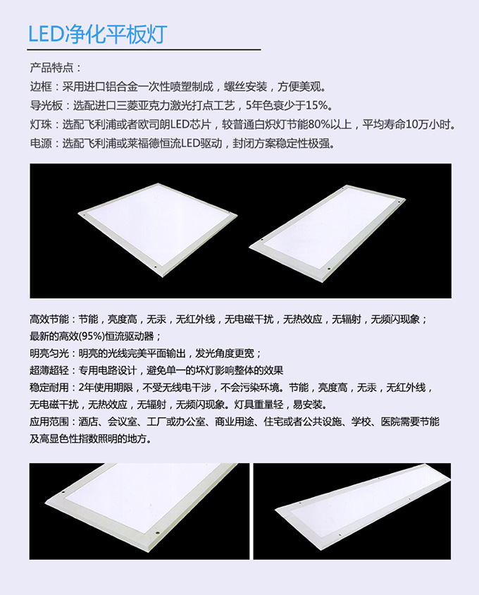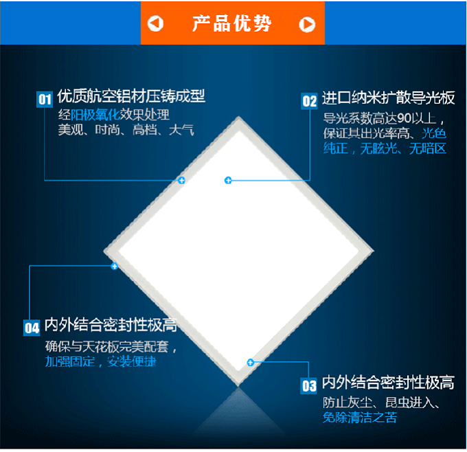 - 產(chǎn)品簡(jiǎn)介:產(chǎn)品特點(diǎn): 1.框架采用6063航空鋁,導(dǎo)熱系數(shù)好,散熱快,減少整燈光衰。 2.直邊設(shè)計(jì),不積塵,易清潔,同時(shí)可以有效減少空氣對(duì)流阻力,使室內(nèi)空氣更清新。 3.燈珠采用2835型號(hào),264珠,不滿載使用,工作電流45MA,較少整燈光衰。 4.導(dǎo)光板采用3MM曰本三菱板材/臺(tái)灣奇美板材,光效好,均勻度好,不會(huì)隨著使用時(shí)間出現(xiàn)發(fā)黃或中間暗兩邊亮的現(xiàn)象。 5.擴(kuò)散板采用PS材料,抗沖擊力強(qiáng)。 6.電源采用進(jìn)口IC,防水灌膠處理,更好的散熱,無(wú)頻閃,不易產(chǎn)生視覺(jué)疲勞,適合好精度或長(zhǎng)時(shí)間工作者。 7.