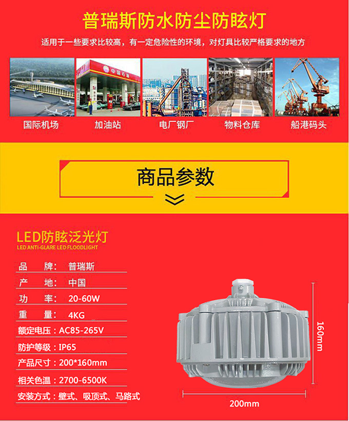 - 產(chǎn)品簡介:產(chǎn)品特點: 1.LED光源,光效高,替代傳統(tǒng)金鹵防眩燈。 2.運用先進的光學(xué)和照明原理優(yōu)化設(shè)計透明件,光線柔 和,照度均勻,無眩光,無重影,能有效避免作業(yè)、 施工人員產(chǎn)生不適合疲勞感。 3.選用高強度鋁合金外殼,進行特殊的密封和表面涂層 處理,防護等級IP66,可在高溫潮濕和各種腐蝕性等 惡劣條件下長期使用。 4.座式、吸頂式和側(cè)壁吸式等多種安裝力式,適應(yīng)不同的工作環(huán)境。