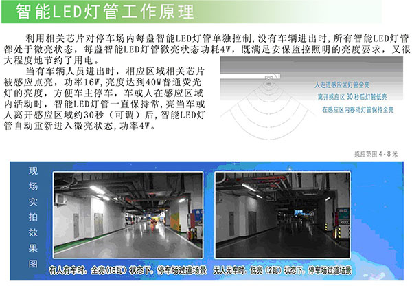 在資源短缺、節(jié)能環(huán)保的主形勢下,智能LED燈管可感控光照強度,減少無謂的電力消耗,是高用電量地下車庫照明的最佳選擇。