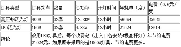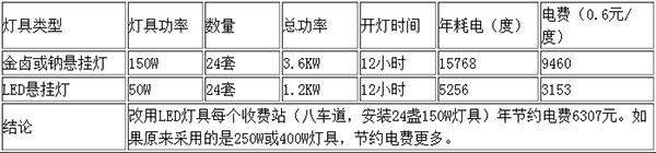 高速公路收費站、服務(wù)區(qū)、加油站、等場合夜間必須開燈,因燈具功率高,開燈時間長,從經(jīng)濟角度考慮采用LED燈具能大大降低電費。高速公路采用LED燈具比使用金鹵燈具或高壓鈉燈具更經(jīng)濟合理。