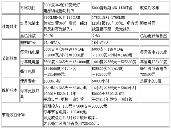 該超市有三層,原使用36W的T8日光燈5000支,經(jīng)節(jié)能改造后使用5000支普瑞斯LED日光燈管PR21L18W,其節(jié)能效果如下。