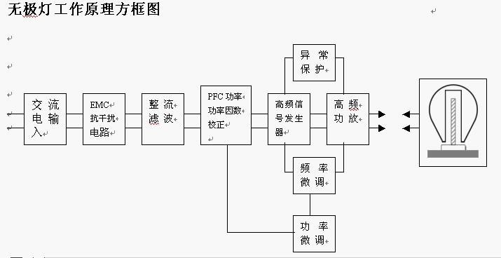 無極燈在結(jié)構(gòu)上大致由三部分組成,高頻電子鎮(zhèn)流器,功率耦合器(內(nèi)耦合,2.65MHZ)和涂有稀土熒光粉的玻璃泡殼(可以是多種形狀,大家見過圓球型的,方形的,等等)。無極燈鎮(zhèn)流器在市電(50HZ)的作用下,產(chǎn)生一個2.65MHz高頻正弦電壓,并同時產(chǎn)生一個3000V左右的點火電壓,通過功率耦合器在涂有稀土熒光粉的玻璃泡殼內(nèi)瞬間建立一個高頻磁場,高頻磁場又同時產(chǎn)生高頻交變電場,導致泡殼內(nèi)部的惰性氣體(氪氣和氬氣的混合氣體)發(fā)生電離并進而產(chǎn)生雪崩效應(應該是大學物理有講,半導體那一章,齊那擊穿和雪崩擊穿), 產(chǎn)生大量的紫外線輻射.熒光粉在紫外線作用下產(chǎn)生可見光.
