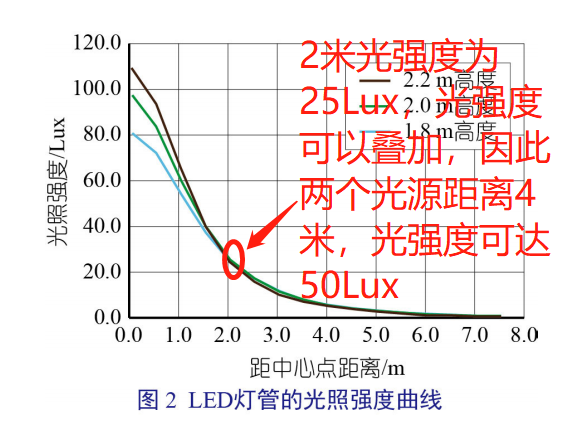 以 LED 燈 管 (18 W、2 100 lm、 6 500 K) 作為單光源對分娩舍內(nèi)的光源進(jìn)行 布置。LED 燈管的光照強(qiáng)度曲線如圖 2。分娩 舍所需的光照強(qiáng)度為 50 Lux ~ 100 Lux。從 圖 2 查得在地面距離燈管中心水平距離 2 m 處的光照強(qiáng)度為 25 Lux。根據(jù)光照強(qiáng)度的可 疊加性,將兩燈管的水平距離設(shè)置為 4 m,則 在兩燈管水平距離中心處地面的光照強(qiáng)度為 50 Lux,滿足分娩舍光照強(qiáng)度需求。